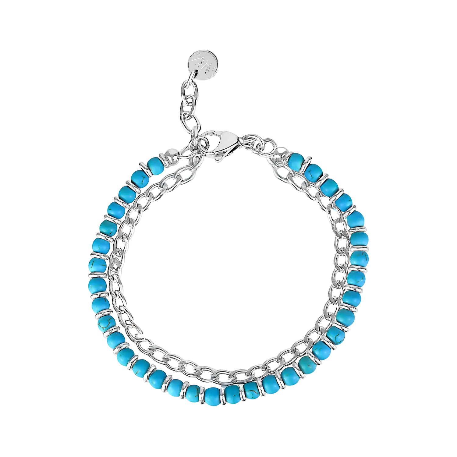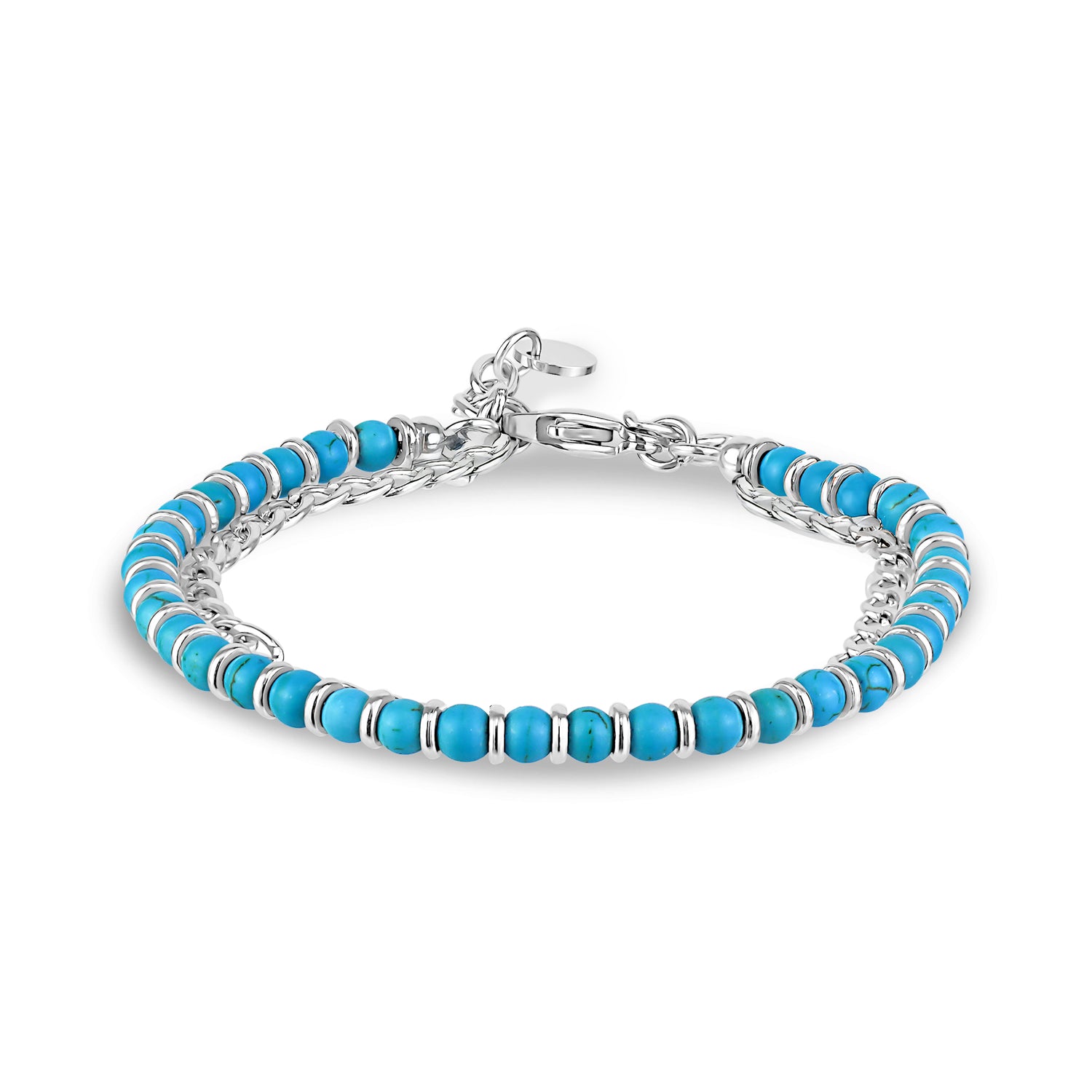 Introducing the Aqua Duo Link Bracelet, an exquisite blend of vibrant beauty and contemporary style. This bracelet features a row of 4mm (0.16") turquoise beads, each framed by gleaming stainless steel disc separators, adding a touch of elegance and shine. Complementing the beadwork, a robust Cuban link chain crafted from high-quality stainless steel offers durability and a sleek, modern look. Perfect for layering or wearing alone, the Aqua Duo Link Bracelet is a versatile accessory that brings a splash of color and sophistication to any ensemble.
