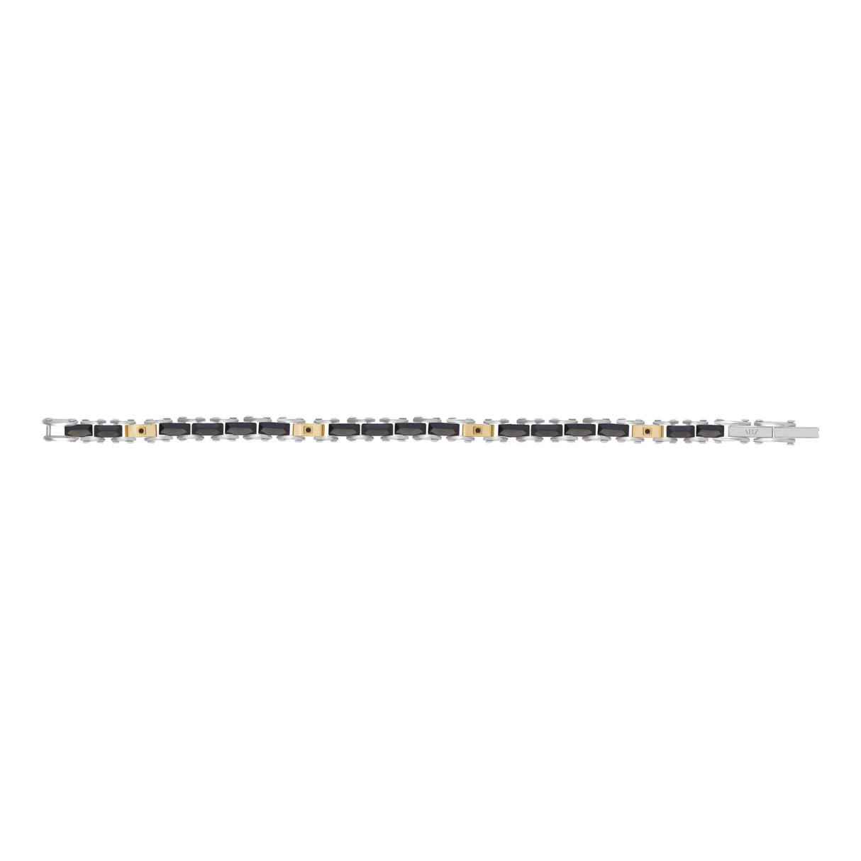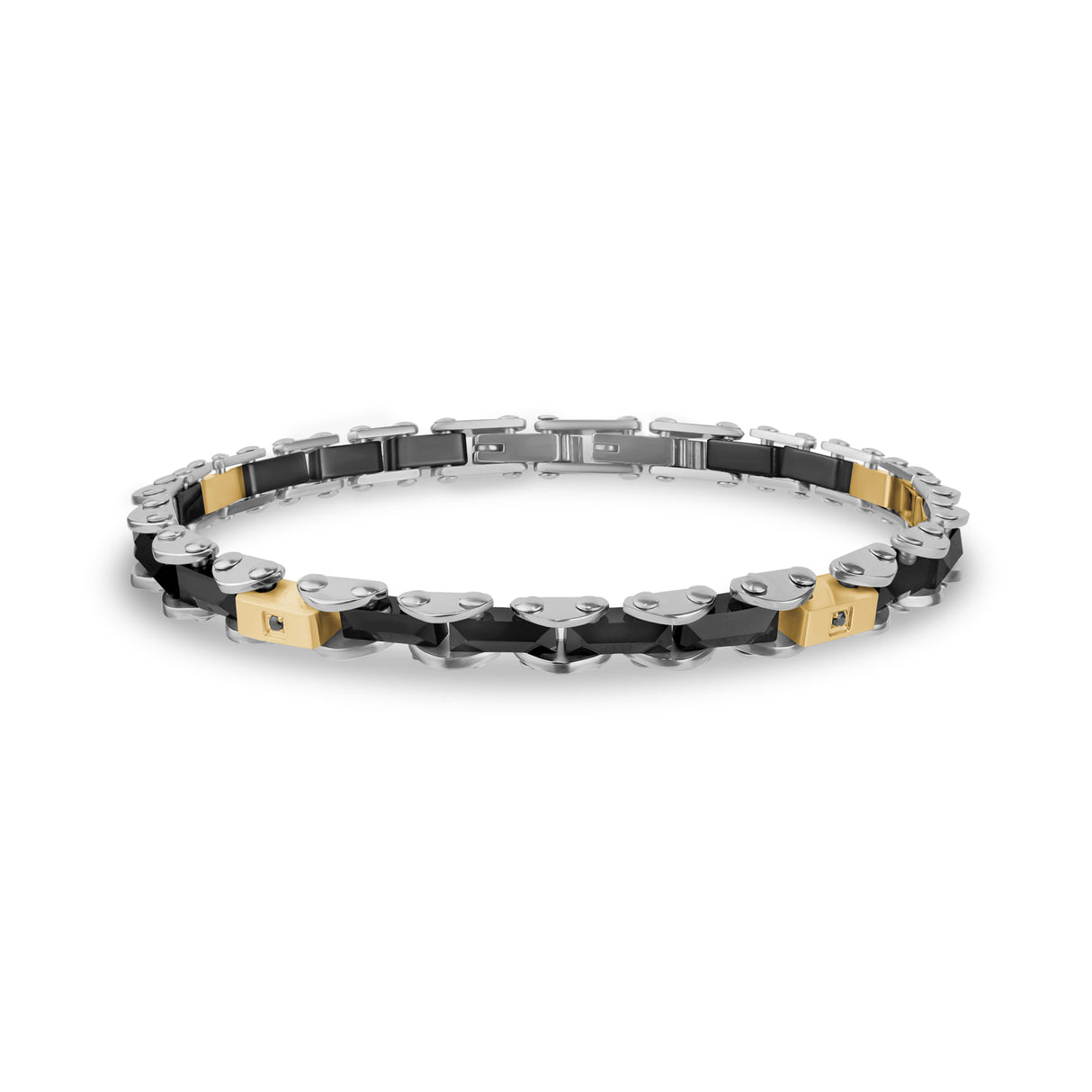 Discover the Ceramic Gold Fusion Bracelet, where elegance meets innovation. This 5mm (0.2") wide bracelet blends matte gold links, each set with a striking black zirconia stone, with contrasting shiny stainless steel and sleek black ceramic. The combination of textures and the sparkle from the zirconia stones add a sophisticated touch to any outfit. Complete with an extra clasp extension for the perfect fit.