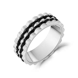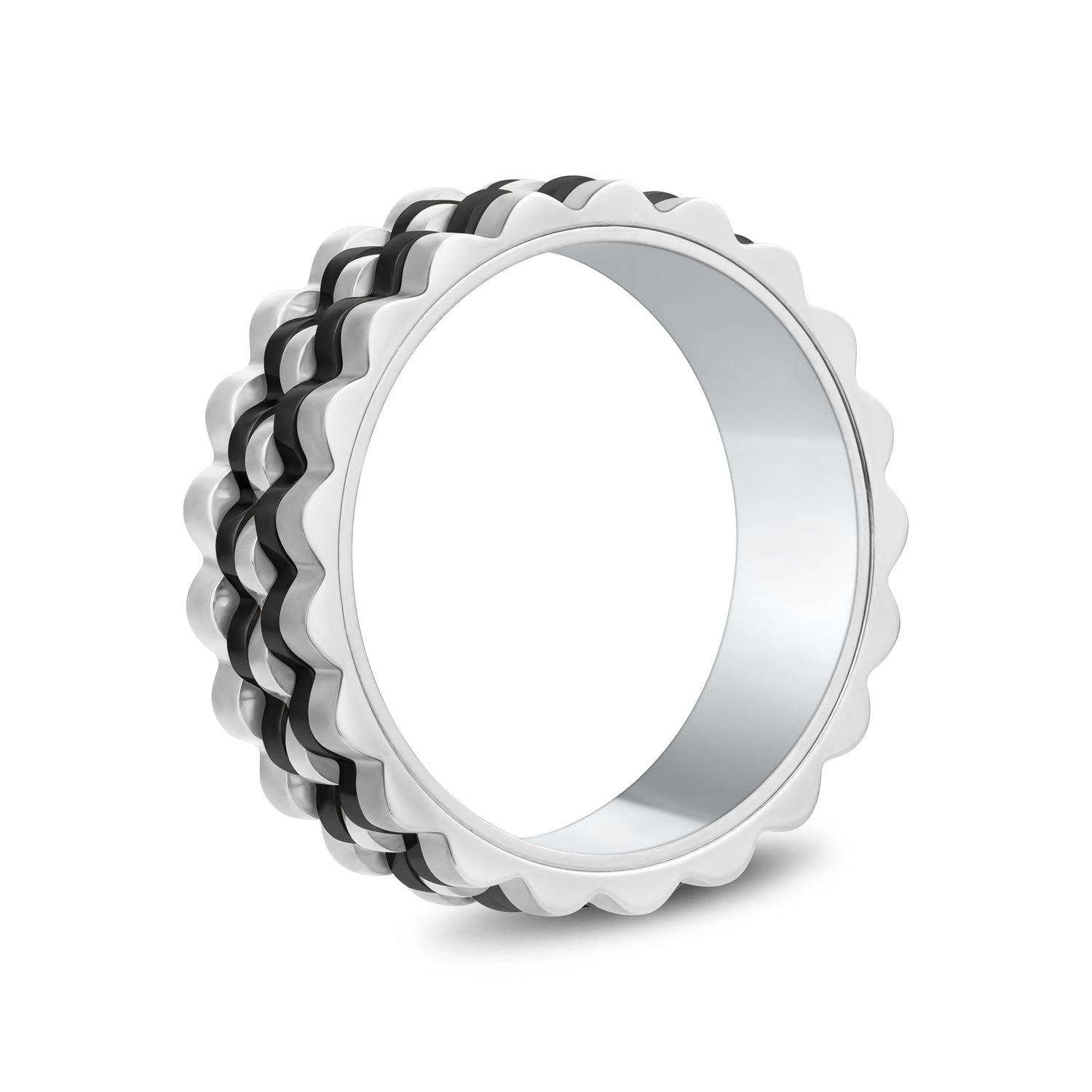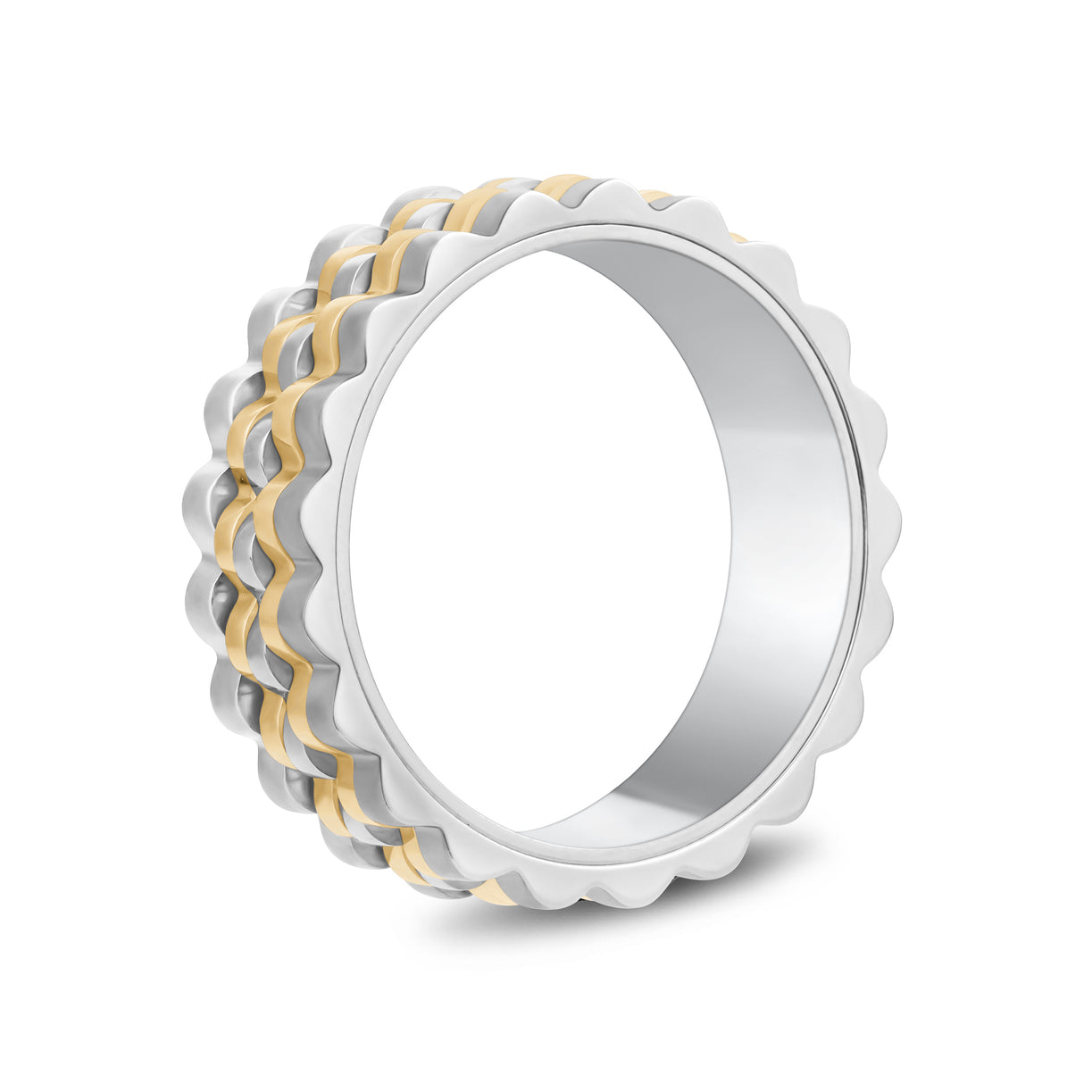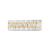 Discover the Ripple Link Two-Tone Band, a sophisticated 7mm (0.28") wide ring that blends matte and shiny finishes for a striking visual contrast. Featuring a unique ripple design, this band is perfect as a statement piece or a distinctive wedding band. Engravable on the inside, it allows for a personal touch, making it as meaningful as it is stylish. Ideal for those who value modern elegance.