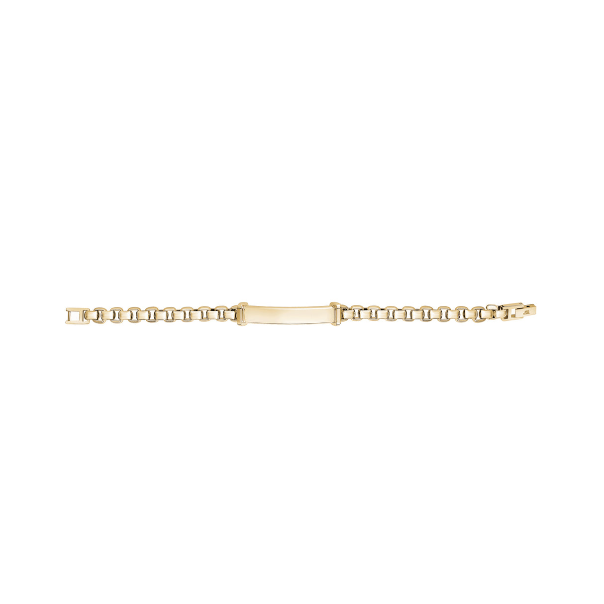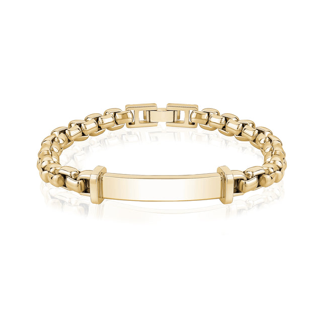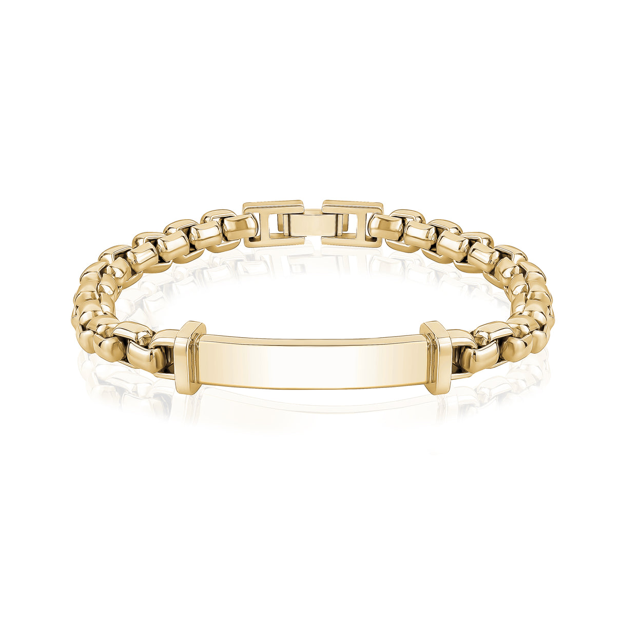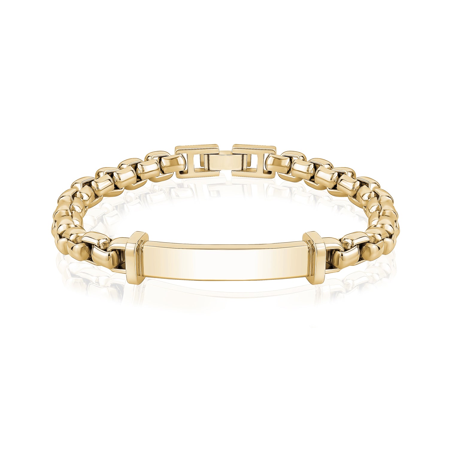 This exquisite Round Box Gold ID Bracelet is the epitome of elegance and customization. Featuring a 7mm round box link chain and an engravable ID plate, it allows for personalization on both the front outside and inside. The ID plate offers space for bespoke engravings, perfect for initials or a personal message. This bracelet is enhanced with a gold finish and includes an extra clasp extension for adjustable fit, ensuring both comfort and style. Whether it’s worn daily or on special occasions, it’s a chic and meaningful addition to any jewelry collection.