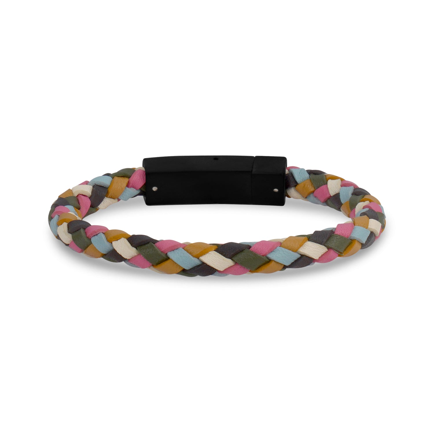 This beautiful 6mm (0.24") multicolored Boho leather bracelet is crafted from Italian leather with a matte black steel clasp. The engravable clasp on the inside allows for personalized touches, and the colors of pink, baby blue, beige, white, green, and black make it perfect for stacking with other bracelets.