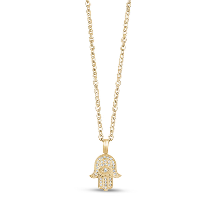 This hamsa pendant is the ultimate accessory for any look. Crafted from stainless steel with cubic zirconia-set stones, it evokes a touch of sophistication while being unisex and genderless. Its pendant size of 15mm (0.6") x 13mm (0.51") is perfect for layering, and is available in 17” and 19” chain lengths with a 1” extension. Revered for centuries, the hamsa is believed to provide protection and is a powerful symbol of good luck.