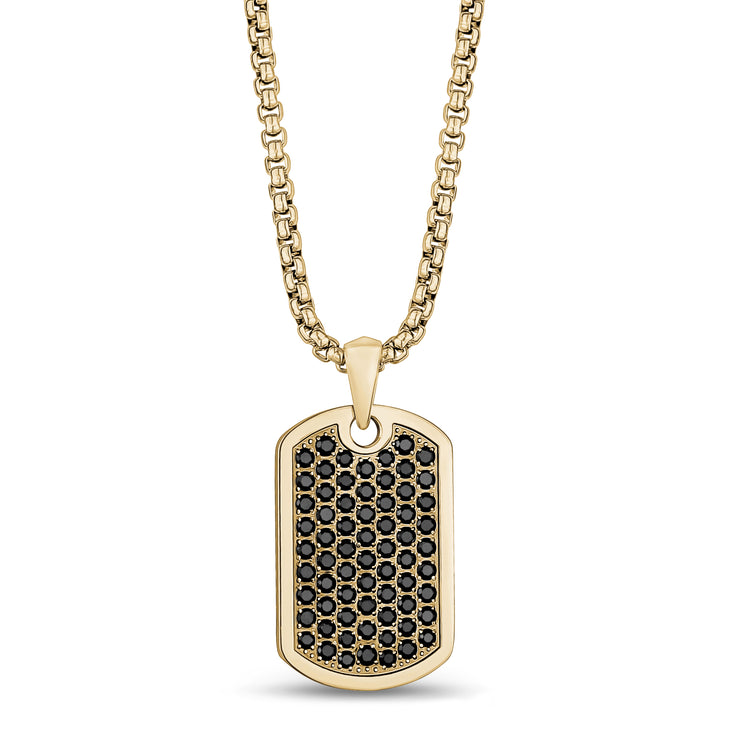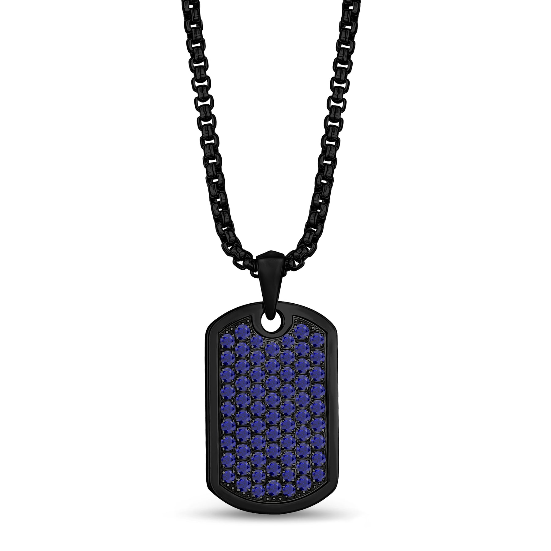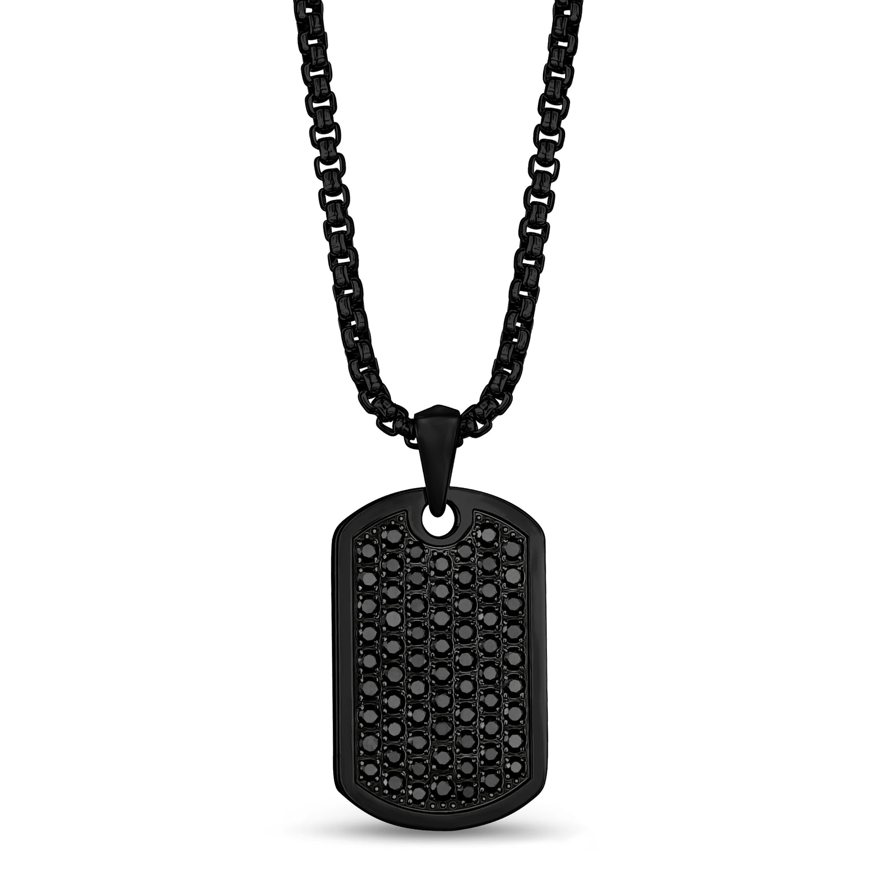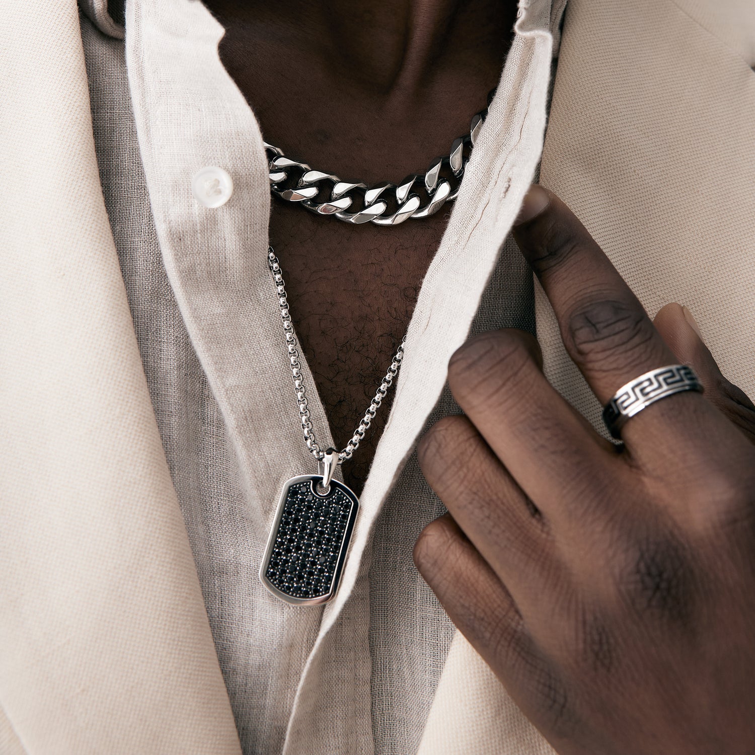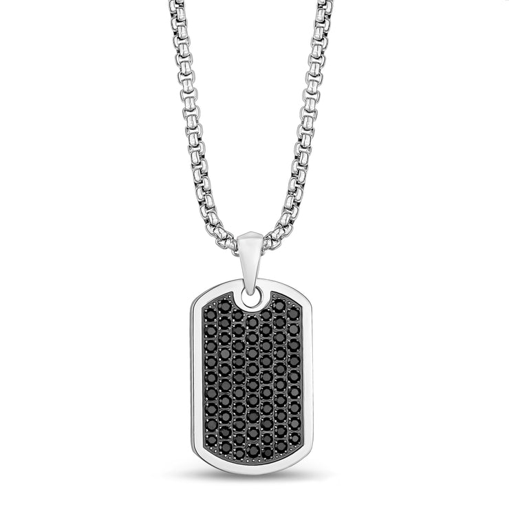 This signature pendant is carefully designed with premium stainless steel and set with cubic zirconia stones. The tag includes a 3 mm stainless steel round box chain and a dog tag that measures 32 mm x 20 mm (1.26" x 0.79"). The back of the dog tag can be customized with an engraved message. Finish: Front Shiny, Back Matte.