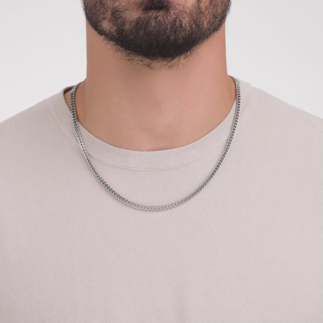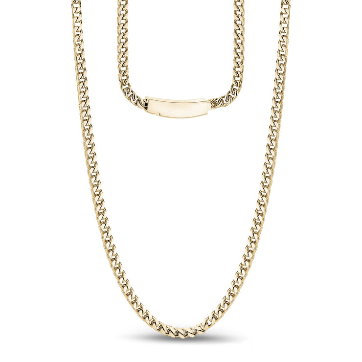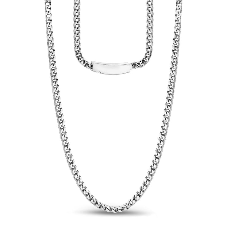 This necklace has a slim imprint, but the Franco link chain gives the piece some more weight. A Franco link is more entwined than a standard Cuban link, which is why this necklace has a more refined appearance. As an added bonus, this chain has been styled out of the best stainless steel. Stainless steel jewelry is a must-have. It is durable, attractive and affordable. You can even make this piece entirely your own with options for personalization. The clasp has plenty of space for a customized message. Pick your size and color preference to make your order right now.