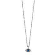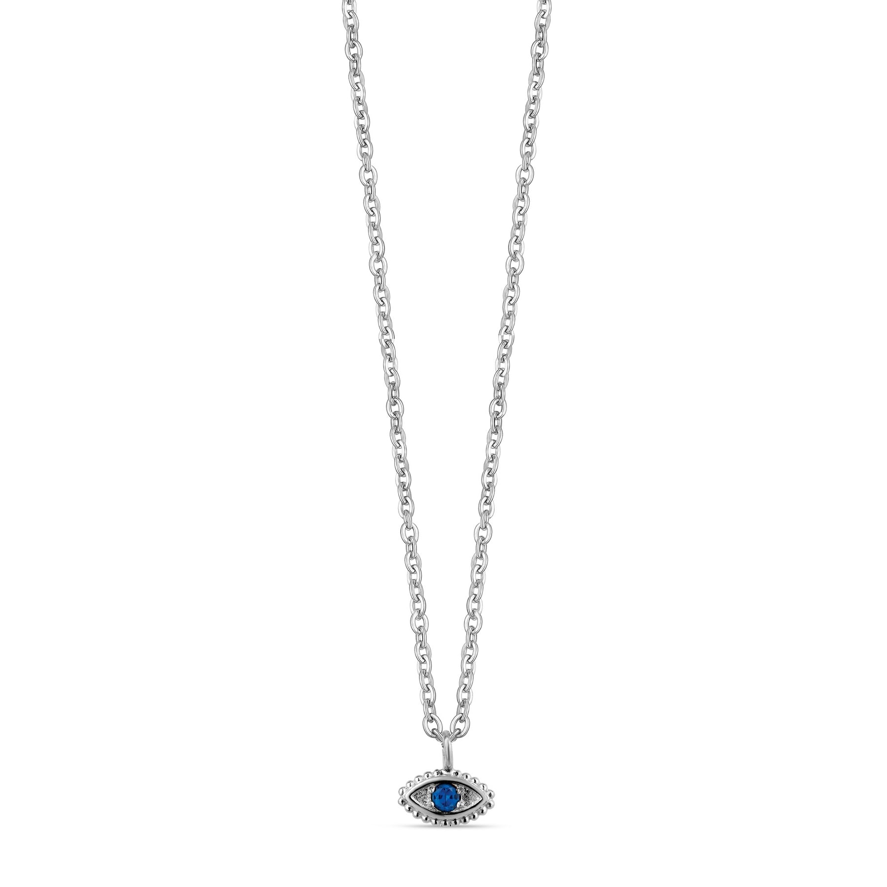 This stylish minimal evil eye pendant is the perfect addition to your wardrobe. Crafted from stainless steel and featuring a dark blue cubic zirconia stone, this pendant is both dainty and beautiful. Evil eye jewelry is an ancient tradition intended to ward off bad luck and can be worn alone or layered for a chic look. With its petite 9mm (035") x 5mm (0.2") pendant size and 17 inch + 1 inch extension chain, this piece is great for everyday wear.