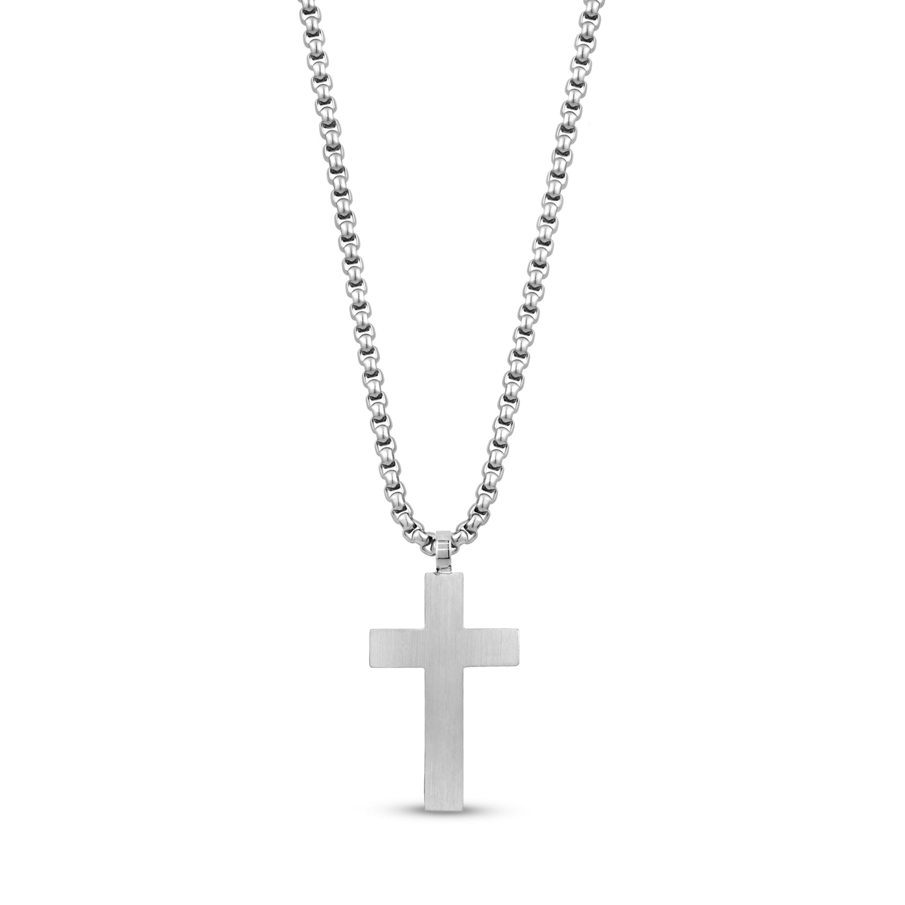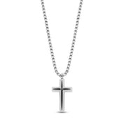 This sleek matte black stone cross pendant is sure to add edge to any outfit. Crafted from stainless steel with a matte finish, this modern design features black detailing on the front for a striking effect, as well as an engravable back side. The 2.5mm round box link chain completes this stylish piece, measuring 30 mm (1.18") x 18 mm (0.71") for a striking statement.