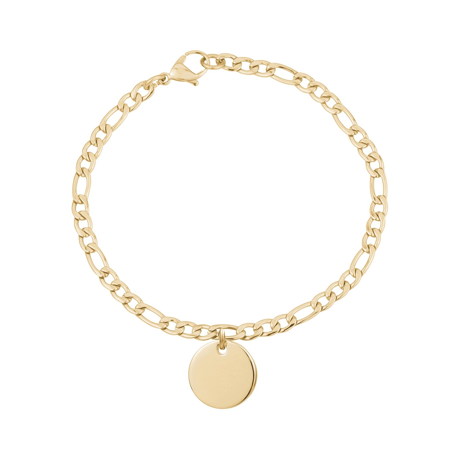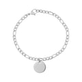 Enhance your personal style with this Figaro link women's bracelet. The Figaro-style links are ideal for a multifaceted look that sports a low profile and still stands out. This is possible thanks to the different sizes of the links. To ensure that the style endures, you can trust the impeccable quality of the stainless steel. It is impressively durable, and it will not discolor with your normal usage. As a finishing touch, this bracelet can actually be personalized. The pendant has a smooth surface, which is perfect for the custom message of your choosing.