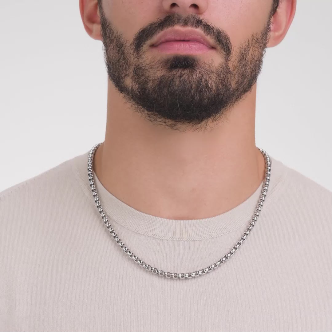 Enjoy the sleek look of this round box link chain necklace. Men's jewelry can be hard to get right, but this bracelet has a streamlined profile that is subtle in its masculinity. It's crafted out of exquisite stainless steel to prevent tarnishing and fading over time. The standout feature of this necklace is the click-in clasp.