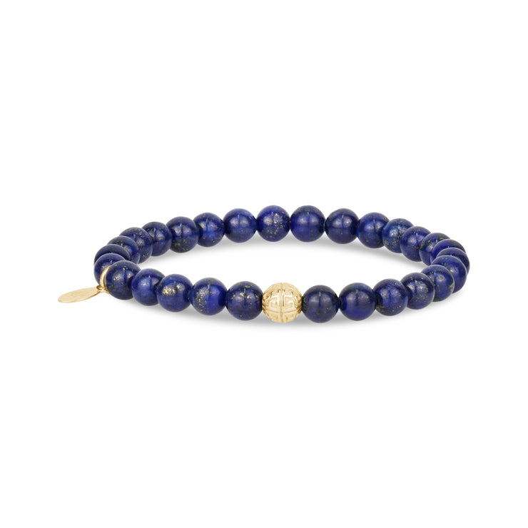 This striking bracelet features 6mm (0.24") genuine Lapis Lazuli beads, celebrated for their rich blue tones and symbolic connection to wisdom, truth, and inner strength. Paired with a signature gold stainless steel bead, it exudes a refined elegance that’s perfect for any occasion. Finished on a durable elastic cord, this bracelet offers a comfortable fit and versatile style, making it ideal for stacking or gifting. Elevate your look with this timeless accessory that blends sophistication with the empowering qualities of Lapis Lazuli.