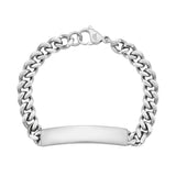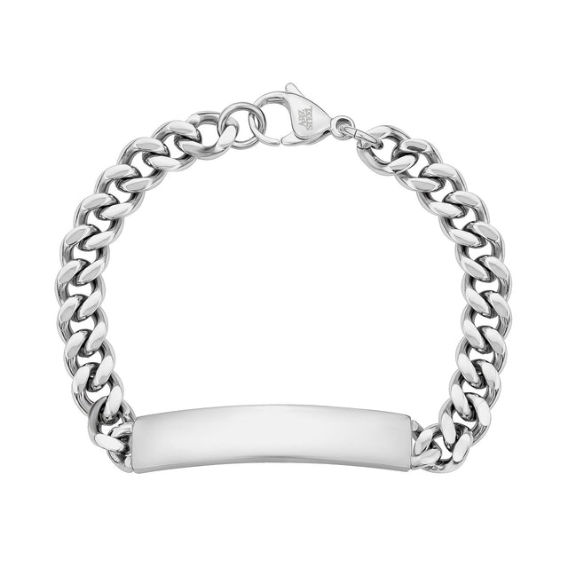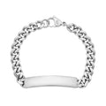 Can your jewelry be both practical and stylish? The answer is yes when you purchase this stainless steel engravable ID bracelet. ID bracelets are often used for practical purposes, but this does not mean that they should be boring. Instead, let your sense of style shine with your ID bracelet. This particular piece is made from shiny stainless steel. To give the bracelet a modern feel, the piece is made with a glistening Cuban link chain. The surface has been sized perfectly to fit your name or other personal details. For more personalization, remember that this bracelet is also available in other colors like black, gold, rose gold and gunmetal.