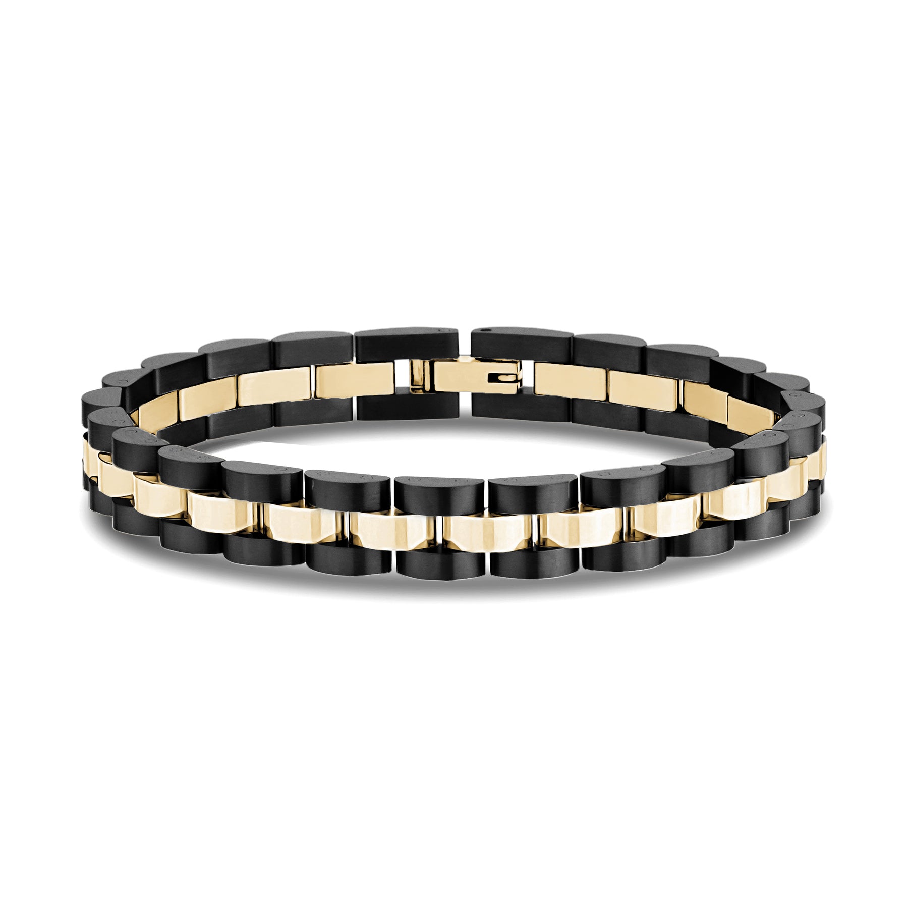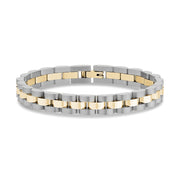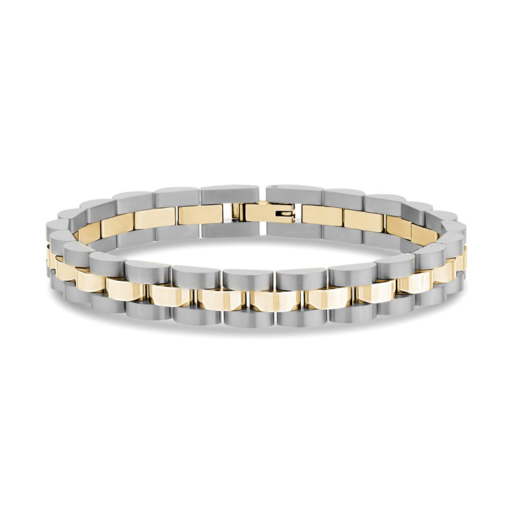 It is time to have fun with your jewelry! This particular bracelet is quite distinctive because it looks like a watch without the bulky face. Indeed, the bracelet does not tell time, but it features a striking watch link chain to create a unique profile on your wrist. The links feature two tones of stainless steel to create depth and contrast.
