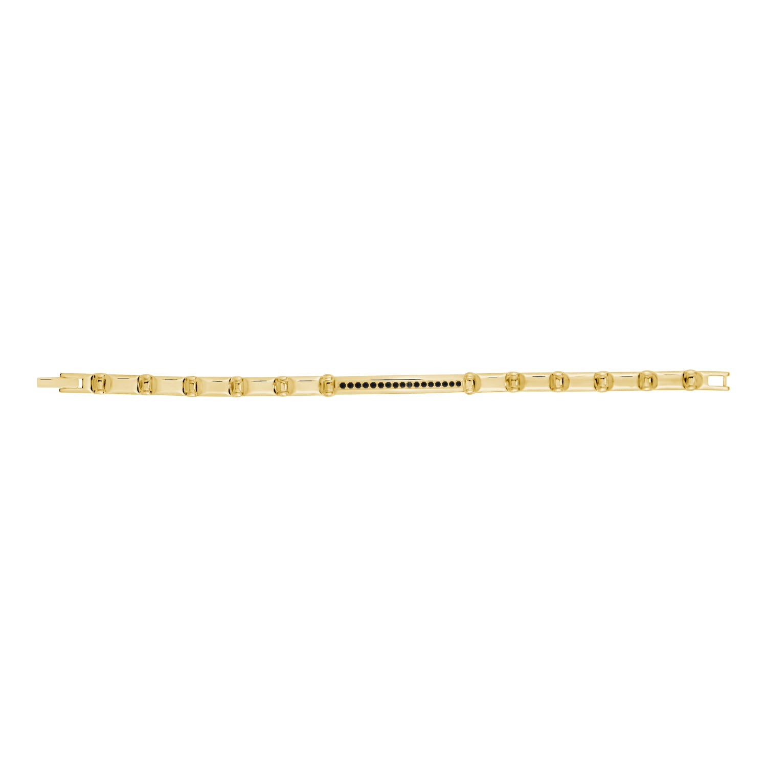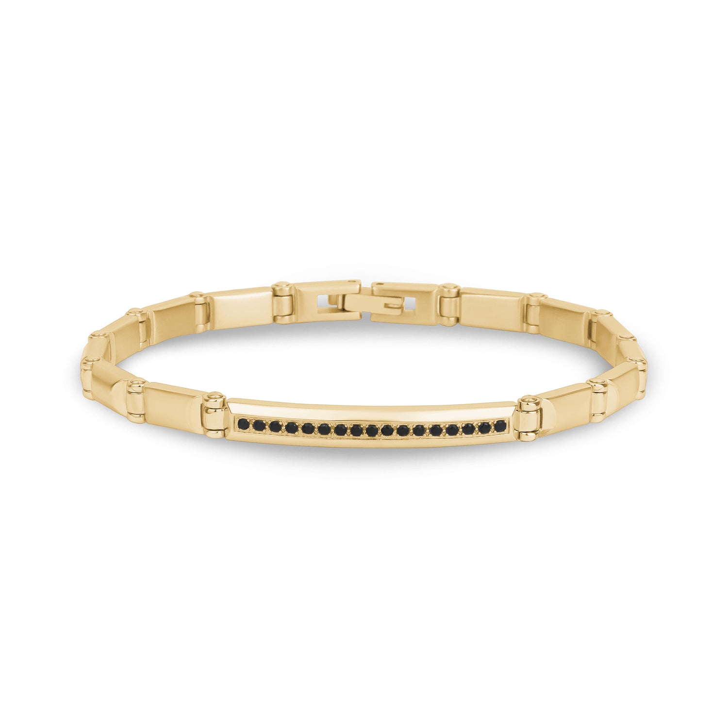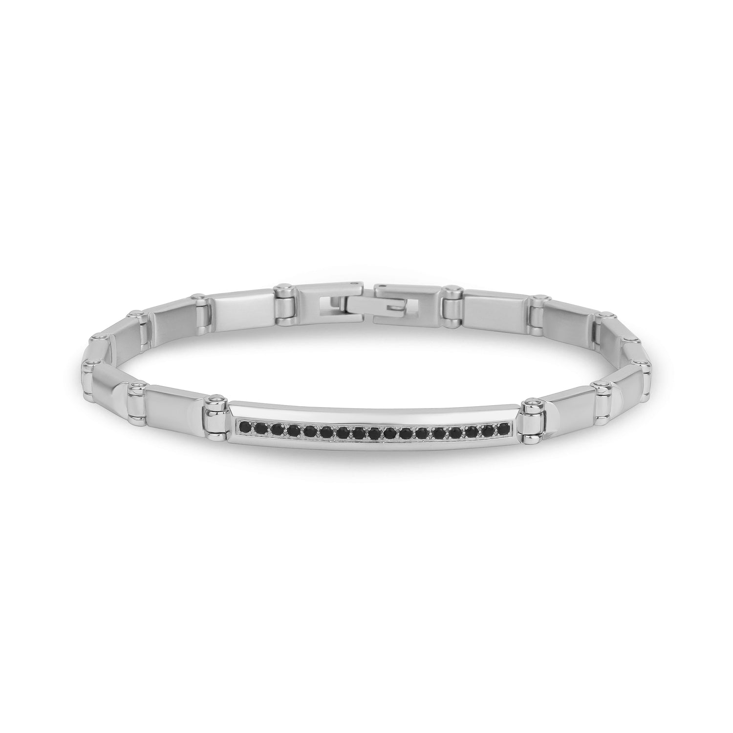 The Black Stone ID Link Bracelet features a stainless steel band with a black cubic zirconia stone on the front and can be engraved on the back. Its designer, unique link design has a width of 5mm, making it perfect for stacking. The bracelet exudes a luxurious look and feel.