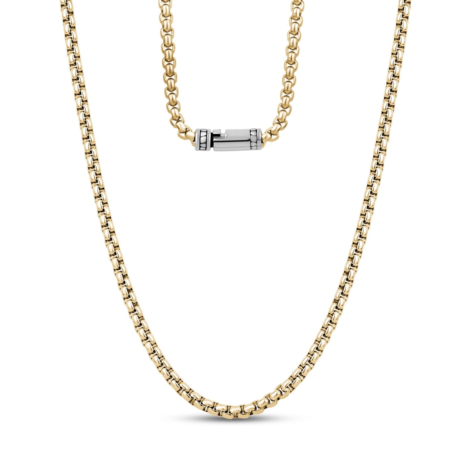 This chain features a detailed and sophisticated clasp, adding a touch of elegance to your ensemble. Made with high quality materials, its 4mm round box link design is perfect for layering, making it a must-have accessory. Stand out with this unique and carefully crafted necklace.