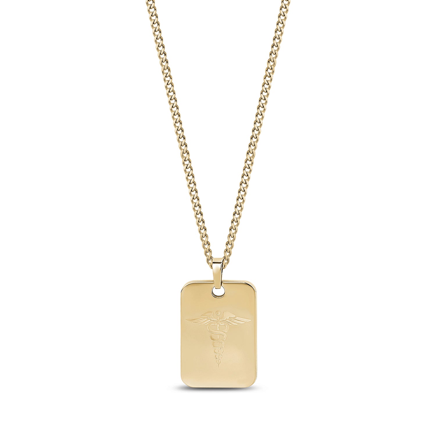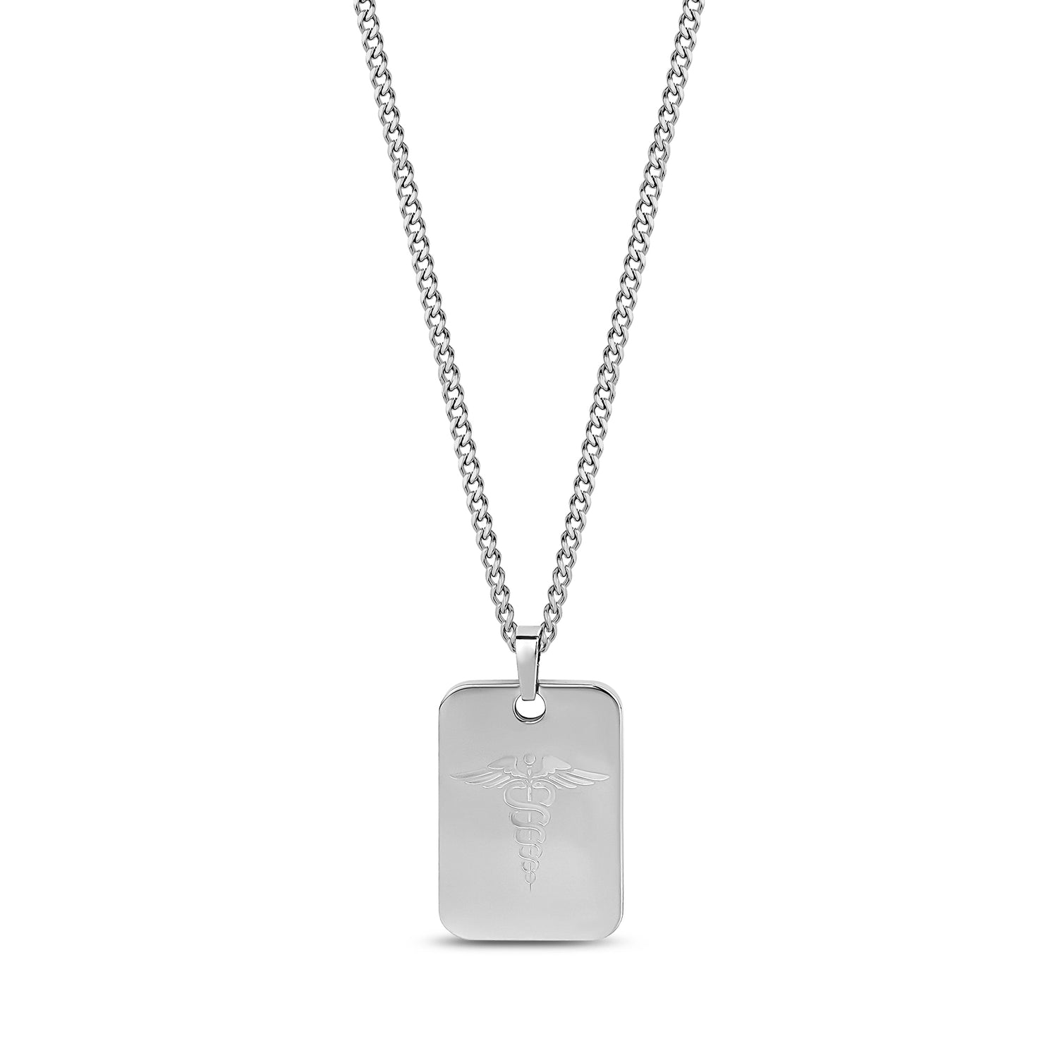 The Medical Caduceus Dog Tag Pendant is a sophisticated and fashionable accessory for any wardrobe. Featuring the iconic Caduceus symbol on the front, this pendant is both stylish and practical. Measuring 36mm x 24mm, it's the perfect size to add your allergies or health concerns on the back, making it a valuable accessory for those with medical needs. It even comes with a 24-inch 3.5mm cuban link chain for added convenience.