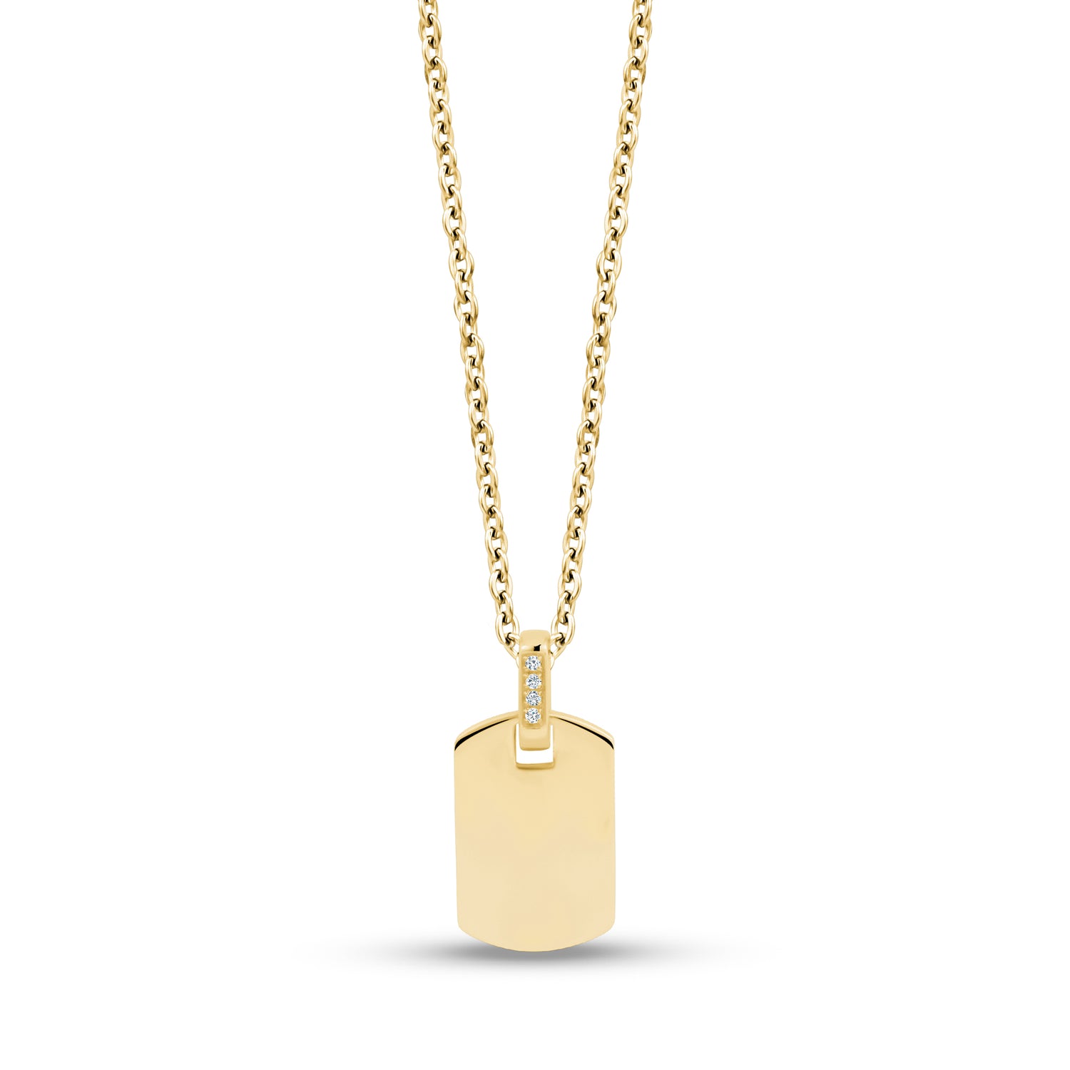 This Mini Stone-Set Dog Tag features a beautiful modern design and is perfect for engraving on both sides. The pendant includes 4 cubic zirconia stone set on the bail and is accompanied by an 18-inch long chain with a pendant size of 18x12mm (0.71"x0.47"). The shiny finish adds a touch of elegance and makes it a must-have gift for any occasion. The chain width measures 1.5mm, making it a unique and stylish piece.