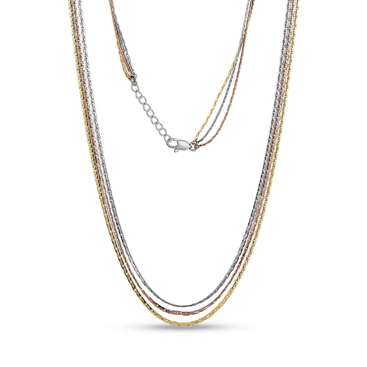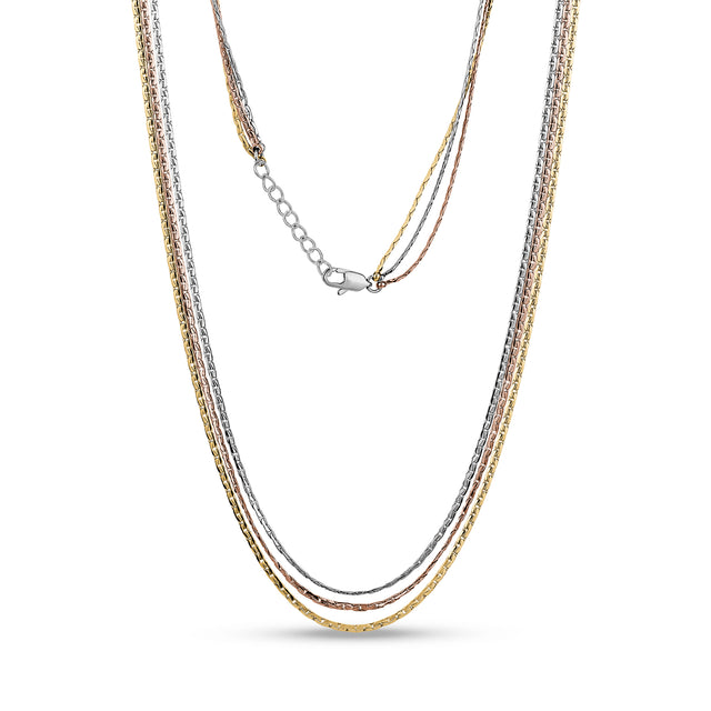 Discover the simple elegance of our Minimalist Tri-Color Link Necklace. Featuring slender 1.5mm (0.06") links in gold, rose, and silver tones, this necklace measures 17" in length and includes an additional 1" extension for a perfect fit. Ideal for both everyday wear and special occasions, this necklace blends versatility with a modern touch, making it a staple in any jewelry collection.