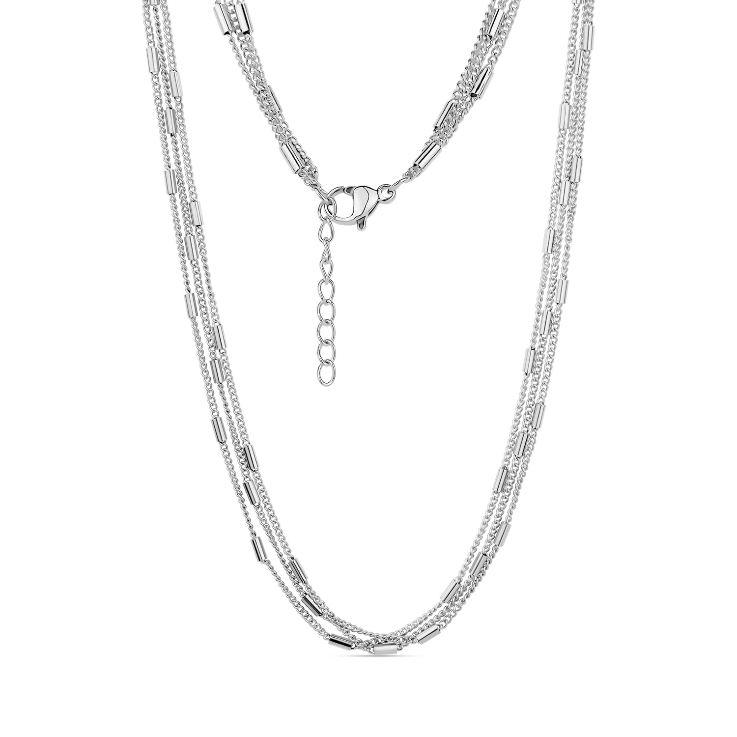 Discover the sleek sophistication of our Multi-Chain Tube Necklace, featuring three strands of curb links interspersed with polished 4mm (0.16") tubes. Each link measures 1.4mm (0.05") wide, crafted for a refined look. The necklace extends from 17" to 18" with an adjustable extension, ensuring a perfect fit. Made from durable stainless steel, this necklace combines modern style with a touch of elegance, ideal for enhancing any outfit.