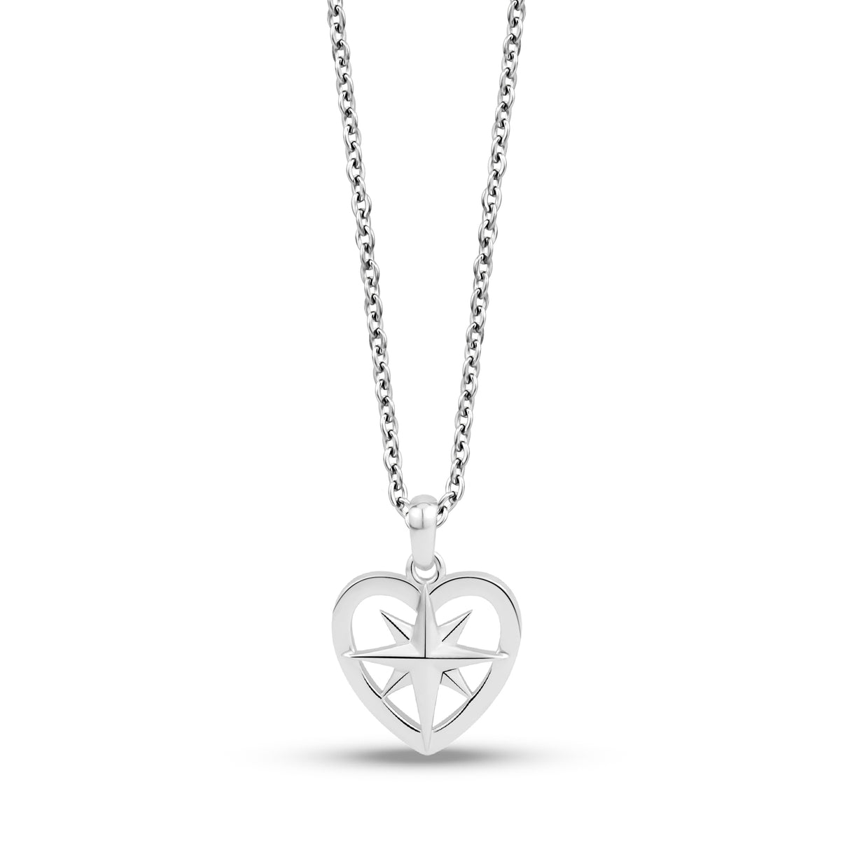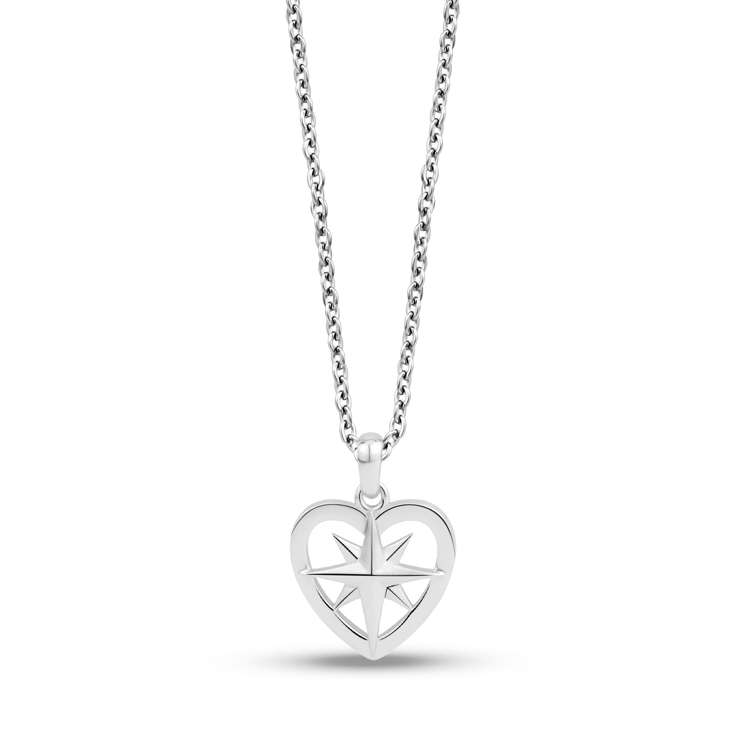 This genderless pendant features a unique design with a stainless steel North Star in the center of a heart shape. The pendant includes compass directions engraved around the sides, and measures 17mm (0.67") in width with an 16 inch chain (plus a 2 inch extension for a total of 18 inches). This sophisticated piece can be worn by anyone and represents a sense of guidance and direction.