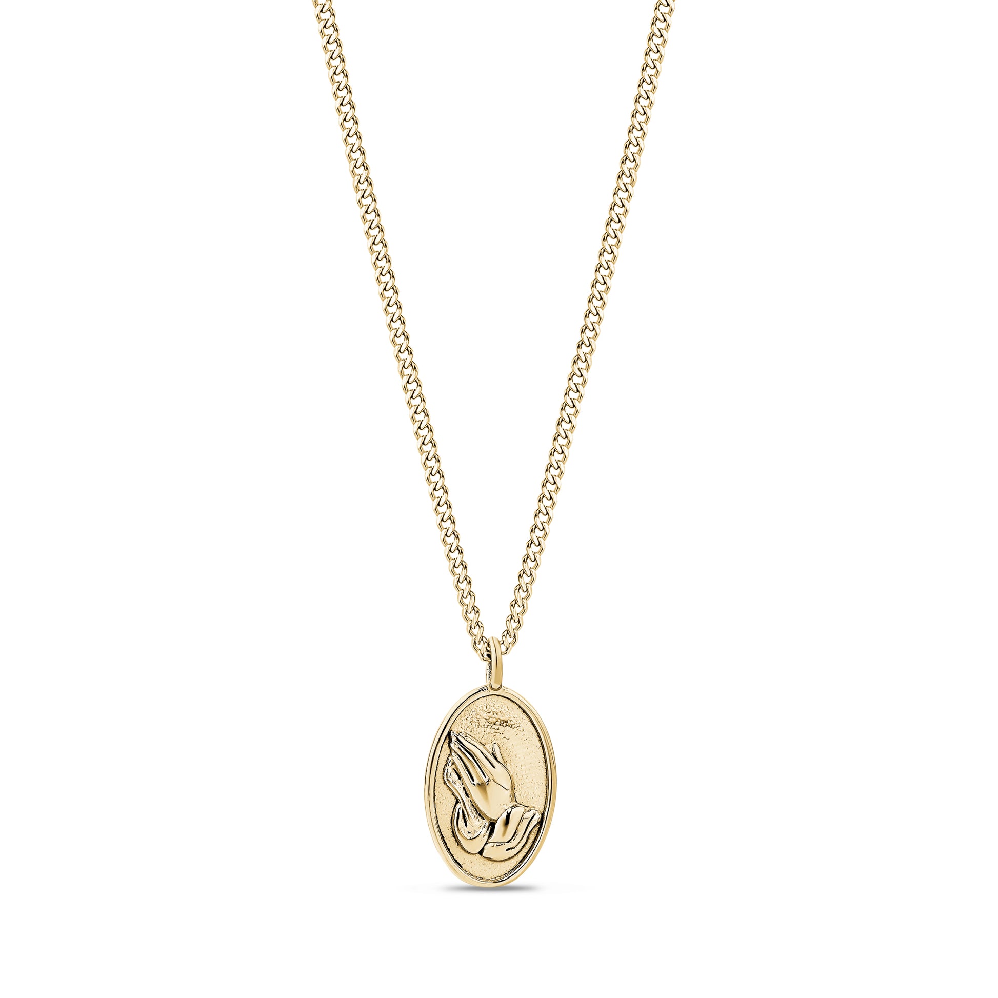 The Praying Hands Oval Pendant offers a meaningful touch in a clean, polished design. The pendant measures 21x14mm, with detailed artwork on the front and an engravable backside for a personal message or initials. Paired with a 2mm Cuban link chain, it delivers a balanced look that works for everyday wear or as a thoughtful gift. Crafted from stainless steel for lasting shine and durability, it serves as a timeless symbol of faith and comfort.