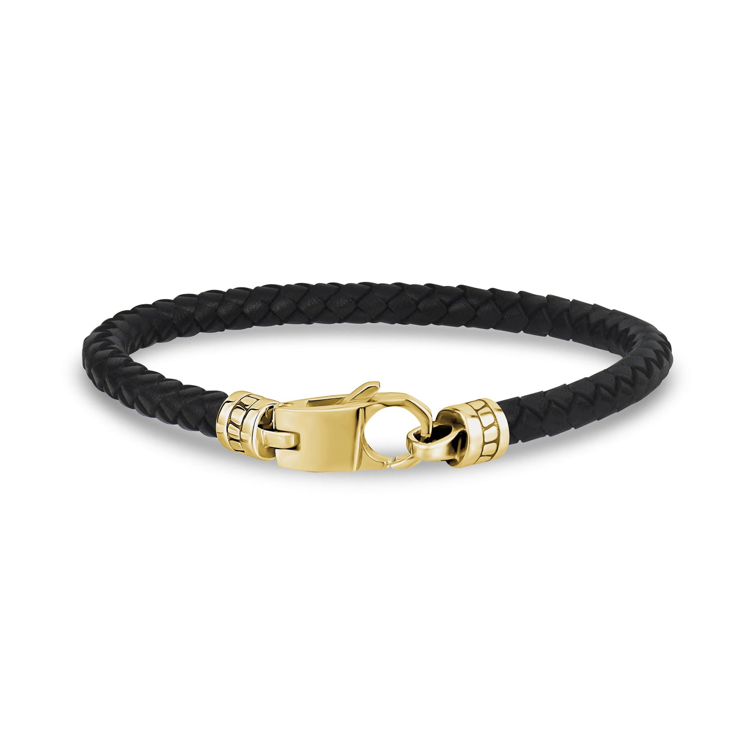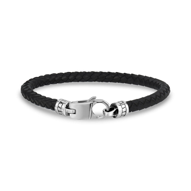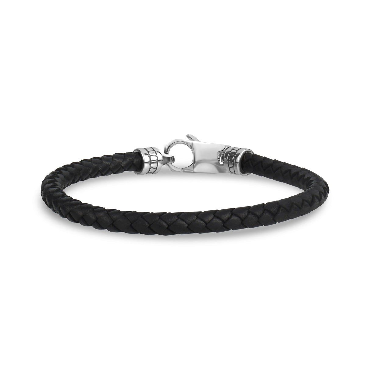 This 5mm (0.2") bracelet features a custom-designed, stainless steel clasp and black braided leather with intricate details. Perfect for stacking, this versatile accessory is a must-have for any fashion-forward individual.