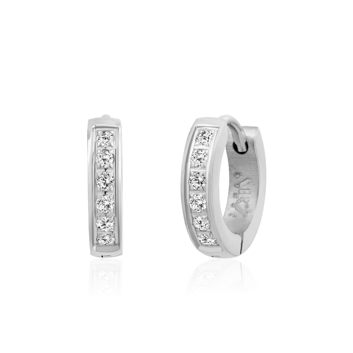 These stainless steel huggie earrings feature 13mm outside diameter and 3mm width, adorned with cubic zirconia stones for a sophisticated touch.