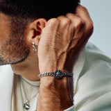 This bracelet is a bold statement piece that blends sleek design with rugged elegance. Featuring a polished stainless steel cuban link chain and a striking compass centerpiece, this bracelet is accented with black cubic zirconia stones for a touch of luxury. The sturdy clasp ensures a secure fit, making it the perfect accessory for those who want to navigate life with style and confidence. Chain width: 6mm. Centerpiece width: 15mm.
