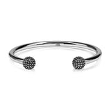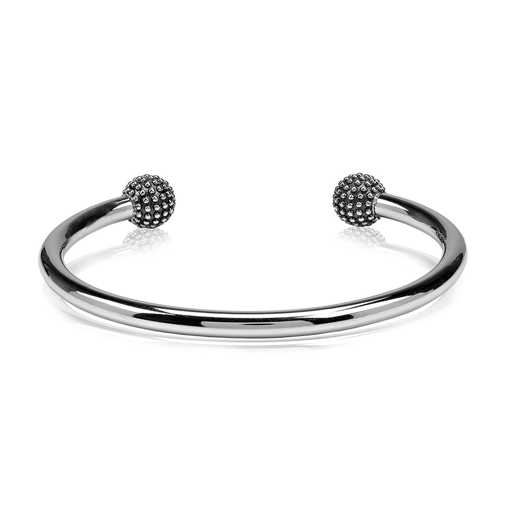 Minimal and classic, this bangle boasts a distinctive design that expertly combines texture and simplicity. Crafted from durable stainless steel, the textured dot ball design with black details adds a touch of uniqueness to any outfit. With a width of 4mm, this open cuff bangle is perfect for everyday wear, while the 9mm wide ball adds a subtle elegance to complete your look. Available with an inside diameter of 58 or 62mm.